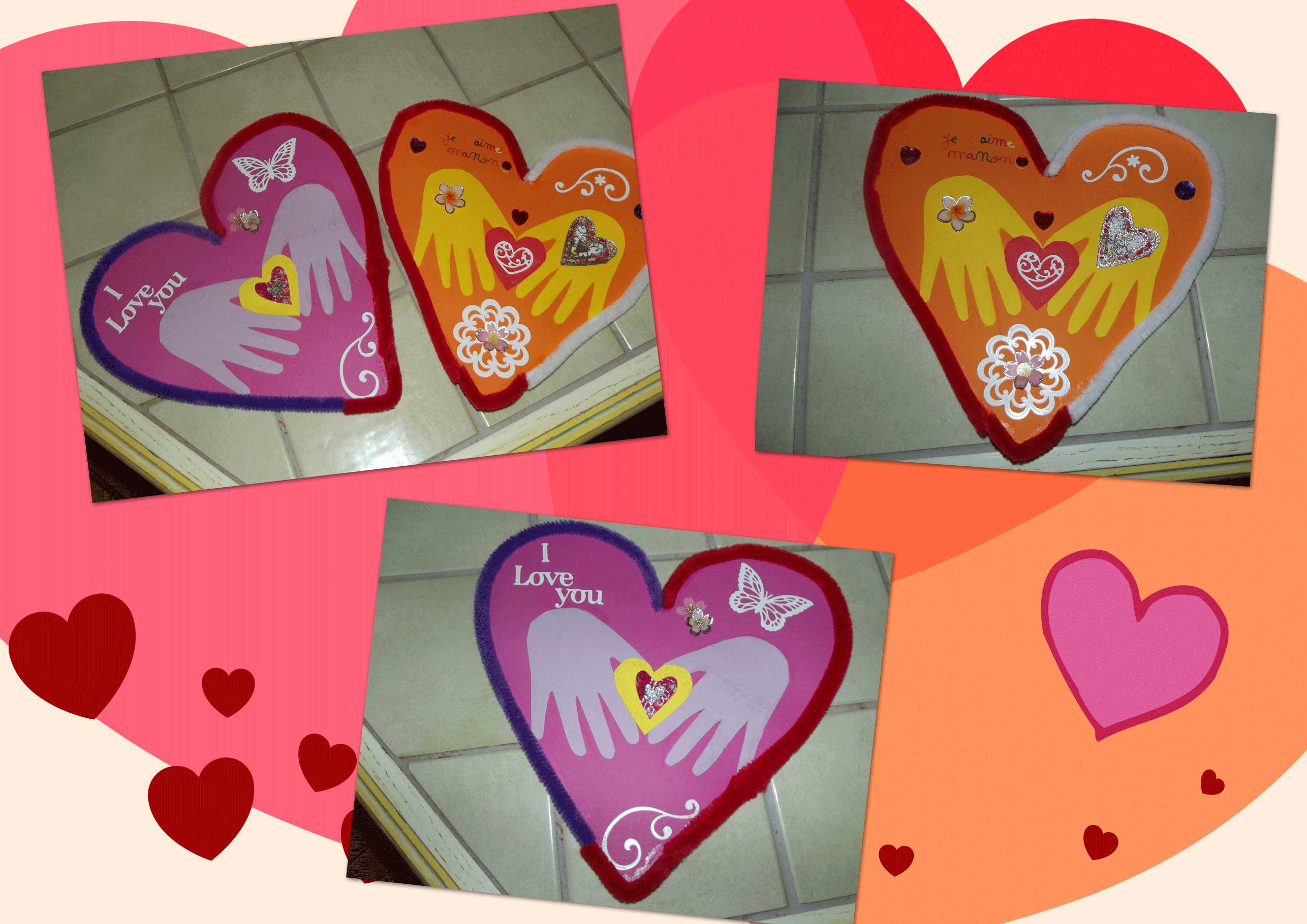 Découper un coeur dans une feuille cartonnée de couleur. Faite les 2 mains de l'enfant et collé les au centre du coeur. Décorer à votre guise. Autour du coeur, coller des cures pipe pour finir le cadeau.